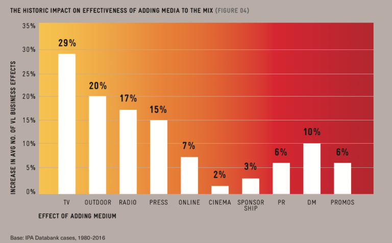 We work on data rather than instinct. The data from our users and from IPA case studies shows that adding a medium to your marketing mix has a cumulative effect on your business growth.
